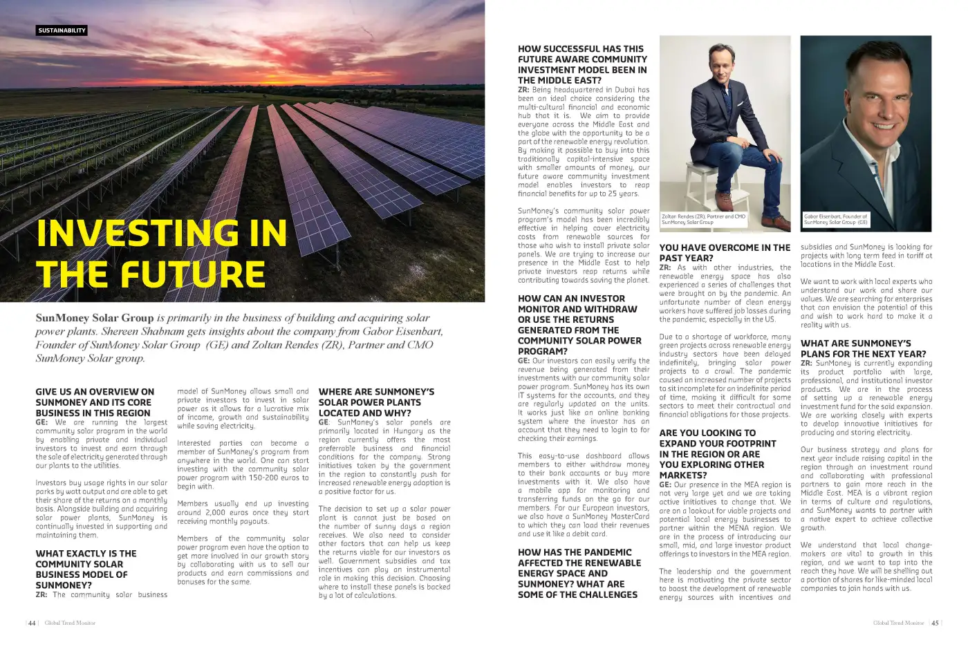 ZR: Being headquartered in Dubai has been an ideal choice considering the multi-cultural financial and economic hub that it is.  We aim to provide everyone across the Middle East and the globe with the opportunity to be a part of the renewable energy revolution. By making it possible to buy into this traditionally capital-intensive space with smaller amounts of money, our future aware community investment model enables investors to reap financial benefits for up to 25 years. SunMoney’s community solar power program’s model has been incredibly effective in helping cover electricity costs from renewable sources for those who wish to install private solar panels. We are trying to increase our presence in the Middle East to help private investors reap returns while contributing towards saving the planet.